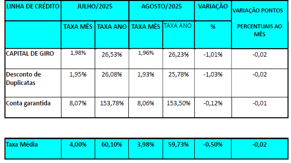 Houve uma redução de 0,50% passando a taxa de juros de 4,00 ao mês (60,10% ao ano) em julho/2025, para 3,98% ao mês (59,73% ao ano) em agosto/2025.