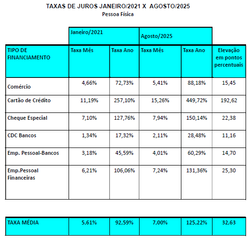 Nesse período, a taxa de juros média para pessoa física apresentou uma elevação de 32,63 pontos percentuais (elevação de 35,24%) de 92,59% ao ano em janeiro/2021 para 125,22% ao ano em agosto/2025.