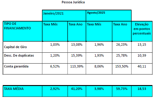 Nas operações de crédito para pessoa jurídica houve uma elevacão de 18,53 pontos percentuais (elevação de 44,98%) de 41,20% ao ano em janeiro/2021 para 59,73% ao ano em agosto/2025.
