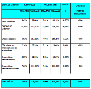 Houve uma redução de 0,99%, passando a taxa de juros de 4,05% ao mês (61,03% ao ano) em julho/2025, para 4,01% ao mês (60,29% ao ano) em agosto/2025.