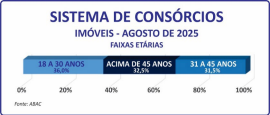 Até agosto, o consórcio de imóveis reunia entre seus participantes ativos 69,0% de pessoas físicas e 31,0% de jurídicas. Nas físicas, a parcela, com 36,0%, foi daqueles que estão na primeira faixa etária, dos 18 a 30 anos. Em seguida, com 32,5%, estiveram os acima de 45 anos e, por último, com 31,5%, os de 31 a 45 anos.